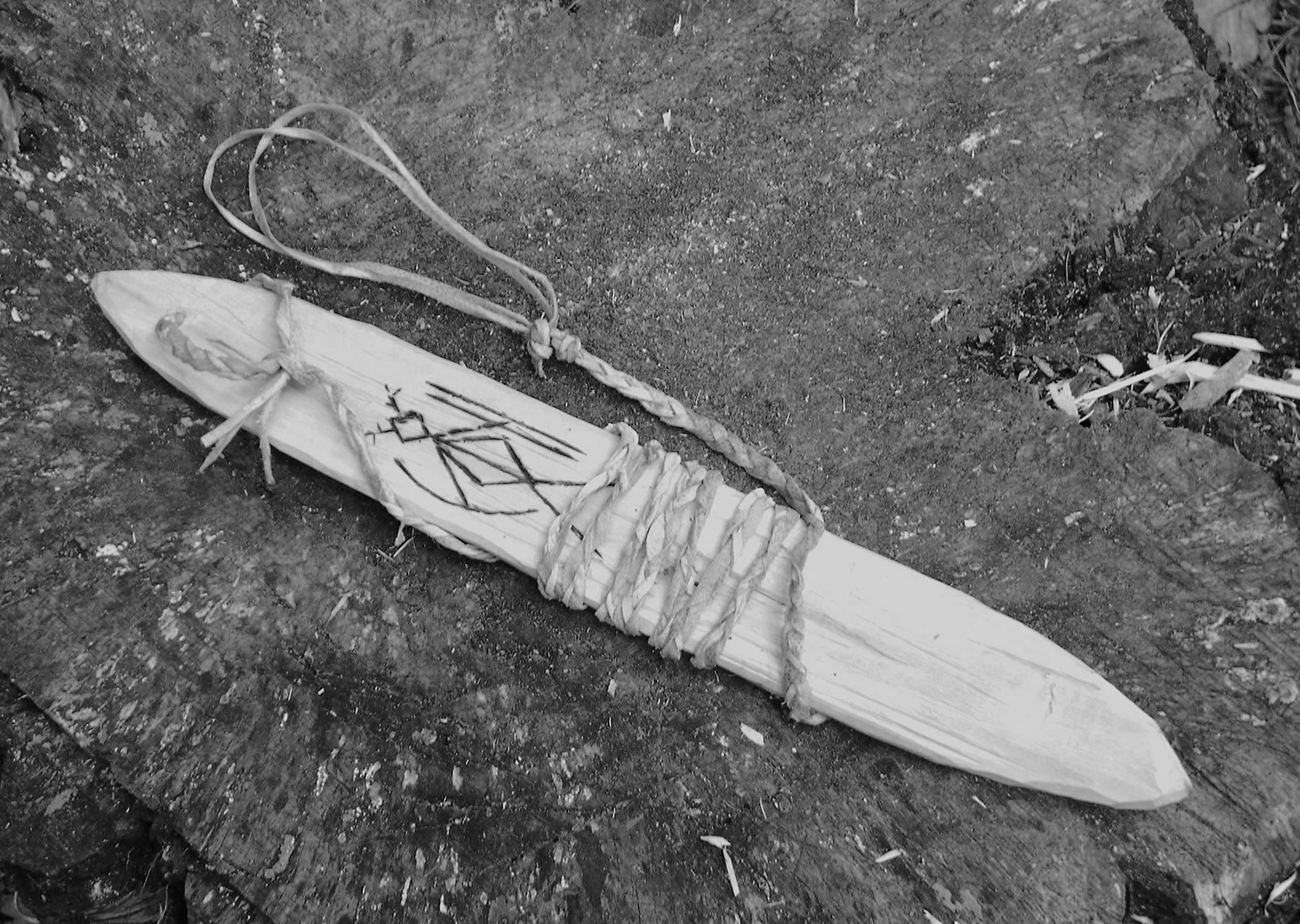 And bull-voices roar thereto from somewhere out of the unseen, there are fearful semblances... From an image as it were the sound of thunder underground is borne on the air heavy with dread." Aeschylus, describing the sound of the bullroarer in the rituals of the Orphic-Dionysian mystery cult. History Although widely thought of as an Aboriginal Australian instruments, the bullroarer is one of the few musical instruments known on every continent. Bullroarers of tremendous antiquity have been found, and it must be considered part of our common human heritage. How to Make Find a fairly well seasoned log or branch at least 8" long, and up to 2' long. A tree that has died standing up, or a branch that has fallen but has been caught up in other branches and kept off the ground are good things to look for. Alternatively you could use bought timber, but it will have less soul. I used a piece of birch wood someone had cut down by the roadside, sawn to length. (fig 1) Split the log slightly off centre with an axe, or better still a billhook, cleaver or splitting froe, and then split it again to make a thin billet of wood from the centre of the log. I'm using a billhook (fig 2). The thinner you can make this now, down to a minimum of about 1/3", the less carving and sanding to do later. Obviously be careful with sharp tools. Hopefully you'll end up with a thin billet (fig3). Pare the billet roughly flat, narrow it and shape the ends into a pleasant curve with a knife or drawknife. The finished bullroarer should be between 6" and 2' long, and between 1" and 2 1/2" wide, and between 1/4" and 1/2" thick (fig 4). Make a hole at one end with a hand auger, knife tip, bow drill, hand drill or power drill (if you must!), or alternatively burn a hole with a small poker. The hole should be big enough to get your chosen cord through. I used the point of my knife to make a hole. If you wish, sand the bullroarer as smooth as you like, starting with 60 or 80 grit sandpaper and working your way through 120, 180 to 240 will make it very smooth quite quickly. Alternatively use dogfish skin as our ancestors would have done, or simply pare it as smooth as you want with your knife, as I've done. Decorate it if you wish by carving or pressing a design into it with a knife or chisel, or burning it in with a hot piece of iron. A carved design can be picked out with paint made from soot or earth colour mixed with fat or oil. Make or buy some cord. A thin flexible cord works best, but must be strong enough not to break when continually twisted and untwisted. I have found hemp string is best. Fine string may need to be pre-twisted before the bullroarer will sound. Tie the bullroarer to the end of the string with a knot that will allow it to turn freely, and won't pull off centre. Perhaps tie a wrist loop in the other end, or secure it to a piece of wood to use as a handle. I decorated my bullroarer with a design showing the god Ull, and made a string from thin plaited red-deer rawhide. (fig 5)